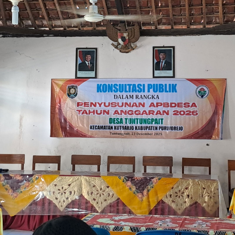 TUNTUNGPAIT, KUTOARJO – Pemerintah Desa Tuntungpait menunjukkan komitmennya dalam transparansi anggaran dengan menggelar Konsultasi Publik dan Musyawarah Desa (Musdes) guna membahas Rancangan APBDes Tahun Anggaran 2026. Kegiatan ini dilaksanakan tepat pada hari Selasa, 24 Desember 2025, dimulai pukul 09:00 WIB bertempat di Balai Desa Tuntungpait. Forum ini menjadi ruang bagi warga untuk memberikan masukan langsung terhadap arah kebijakan pembangunan desa di tahun mendatang.